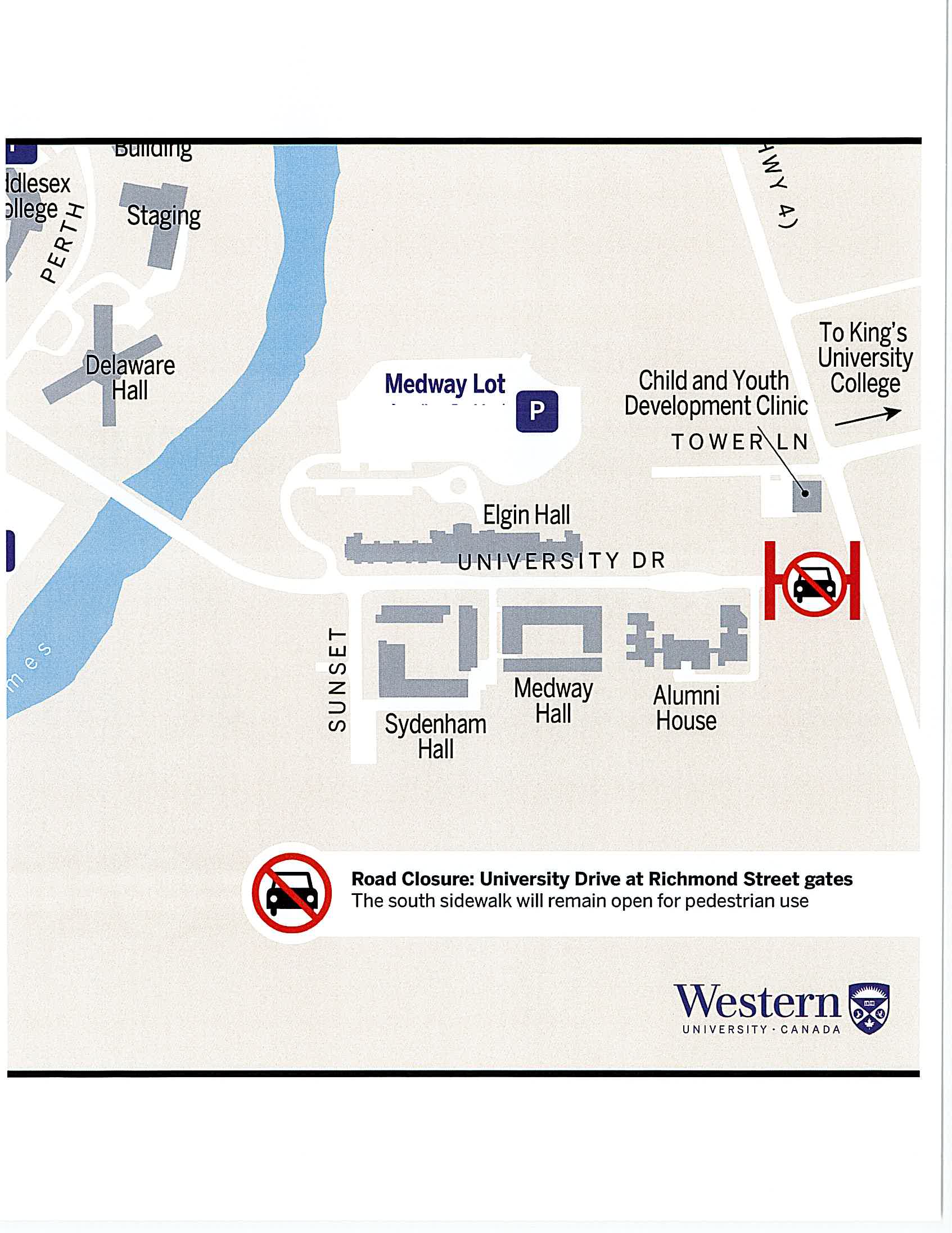 • L’accès à la University Drive depuis la rue Richmond sera fermé aux véhicules motorisés de 7 h, le mardi 14 octobre, à 17 h, le vendredi 24 octobre, afin de permettre la réalisation des raccordements souterrains d’eau et d’égouts pour la nouvelle résidence étudiante.